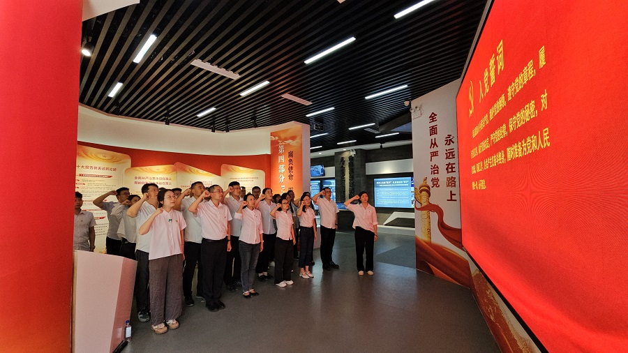 在講解員的帶領下,全體人員先后參觀了“窯洞之問、兩個答案”“挺紀在前、筑牢防線”“以案為鑒、警鐘長鳴”和“肩負使命、砥礪前行”四個展區。借助多媒體技術、圖文資料、案例展示等,生動呈現黨的反腐倡廉歷程和當前反腐敗斗爭形勢;精選典型腐敗案例和微電影《初心》,深刻揭示違紀違法對個人、家庭和社會的多重危害,給參觀人員帶來強烈思想沖擊。活動最后,全體黨員一起重溫入黨誓詞,面向黨旗莊嚴宣誓,進一步強化理想信念和紀律意識。
